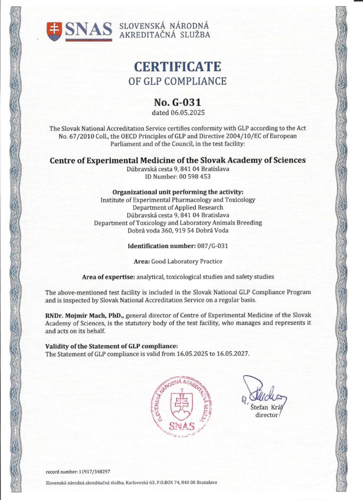 Selected research laboratories of the Institute of Experimental Pharmacology and Toxicology at CEM are accredited by the Slovak National Accreditation Service (SNAS) for conducting toxicological studies and safety studies under the Good Laboratory Practice (GLP) regime.
